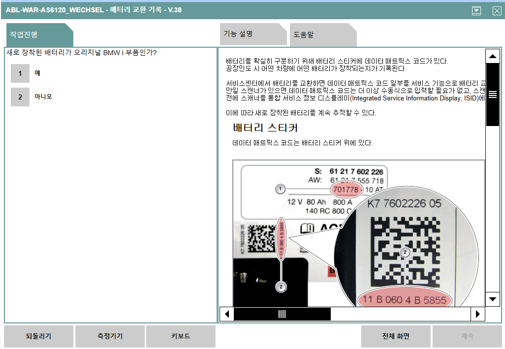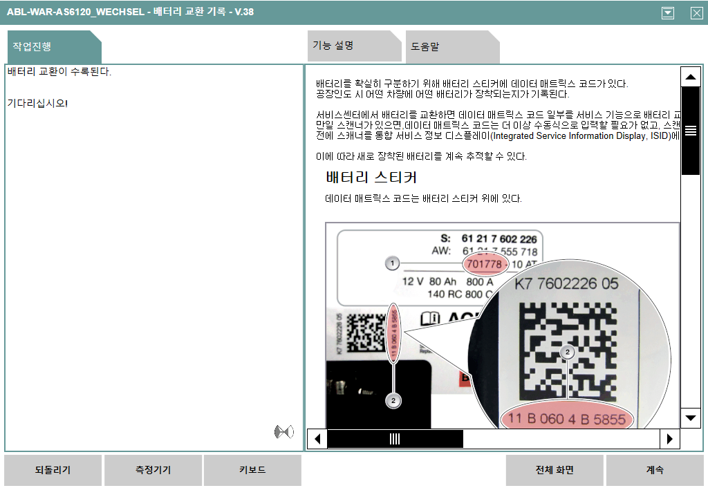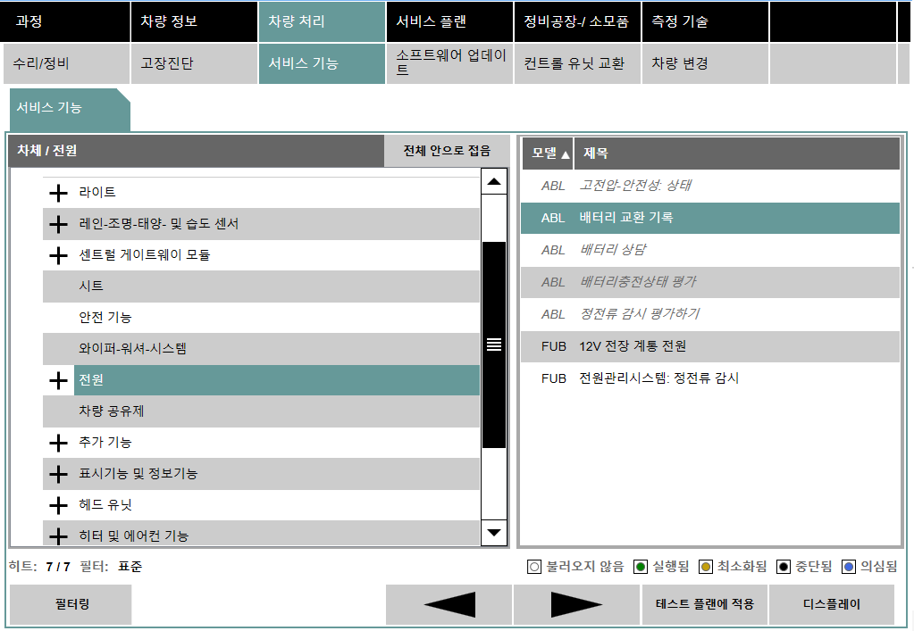 다음 경로를 통해 배터리 교환을 기록한다: - 서비스 기능 - 차체 - 전원 - 배터리 교환 기록