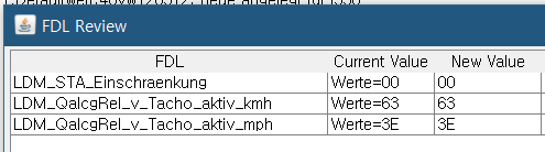 2) LDM_QalcgRel_v_Tacho_activ_kmh - werte 값을 63으로 변경 (99km/h 제한속도 풀기 : 실제 140km 까지 사용가능)